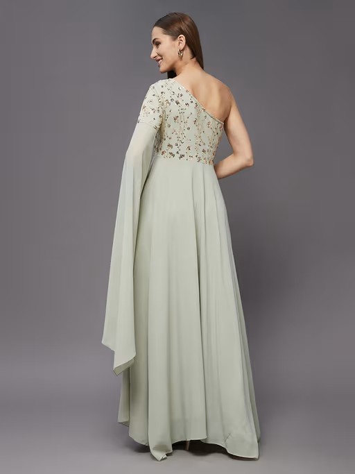 Women's Dusty Green And Golden Embellished Asymmetric Maxi Party Dress