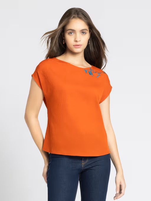 Boat Neck Drop Shoulder Poly Crinkled Fabric Top Has Embroidery On Shoulder