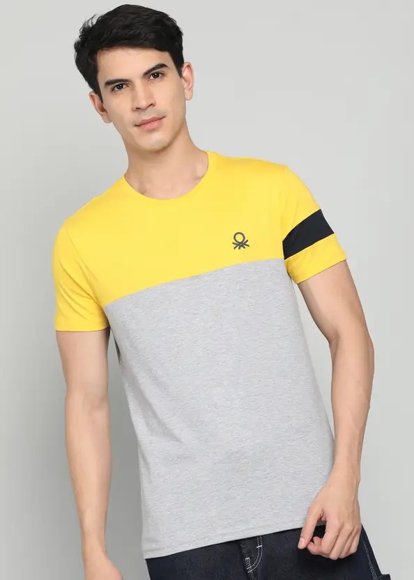 Men Colorblock Round Neck Cotton Blend Yellow T-Shirt