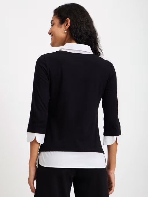 This black and white tee has a shirt collar, three-quarter sleeves and colour block detail. Made from Cotton Lycra Poplin, it is soft and comfortable to wear. - 9AM-to-9PM- Non-transparent- Easy Care - Ideal for travel- Breathable- Stretchable