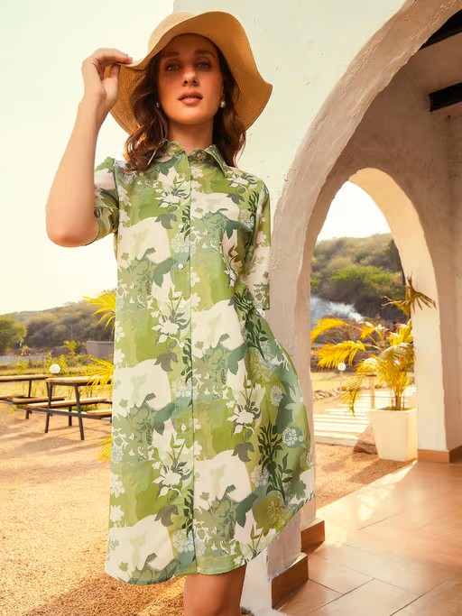 Be The Centre Of Attention With This Captivating Green Floral Printed Cotton Linen Shirt Dress From Athena. Made From High-Quality Cotton, This Piece Features Half Sleeves And A Collar Neck. Style It With Minimal Jewellery And Sandals To Complete The Ensemble.