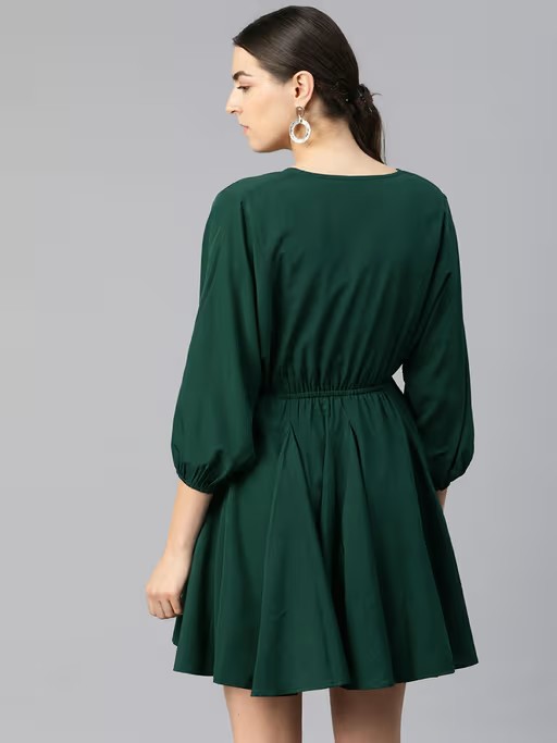Bottle green flared dress||Green solid woven fit and flare dress, has a V-neck, three-quarter sleeves, and flared hem
