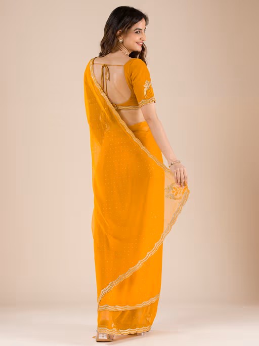 Step into grace with this Koskii Orange Stonework Chiffon Saree with Unstitched Blouse. Koskii ethnic sarees come with a blouse piece, which can be stitched according to your taste and preference, with this beautiful design and fabric, this saree will fetch you oodles of compliments and praise