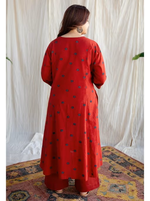 Red A-Line Ajrakh Printed Cotton Kurta With Split V Neck & Embroidered