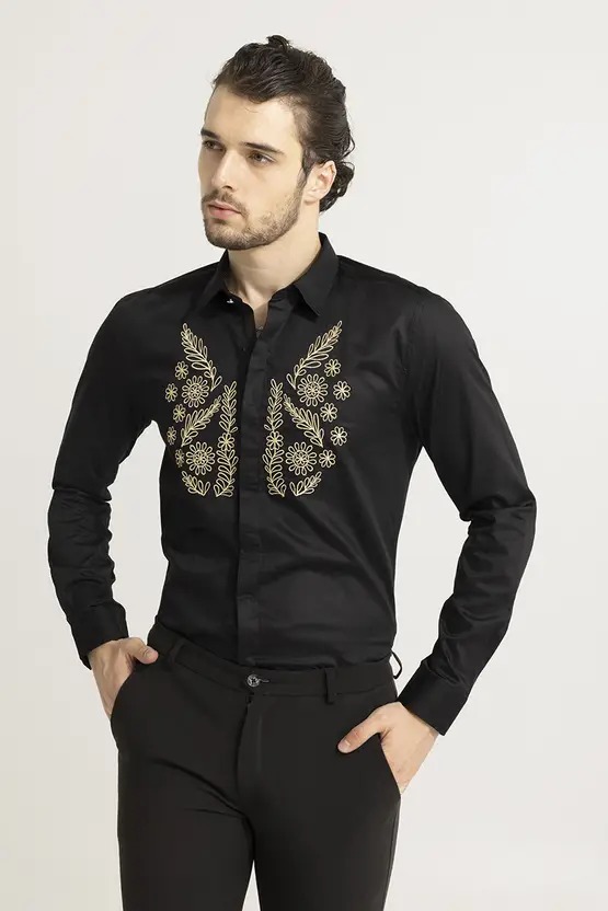 Men Slim Fit Embroidered Spread Collar Casual Shirt