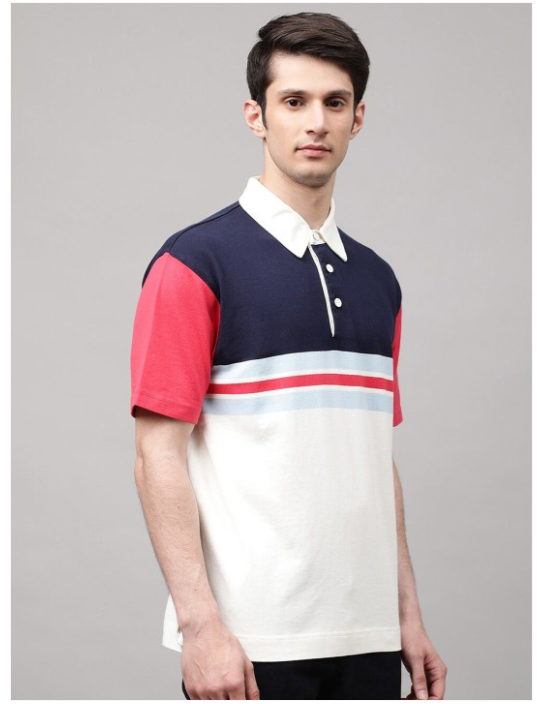 Men Blue & White Colourblocked Polo Collar Pure Cotton T-shirt