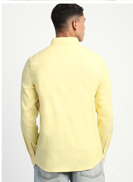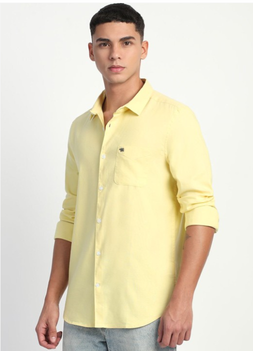 Yellow solid opaque Casual shirt ,has a spread collar, button placket, 1 patch pocket, long regular sleeves, curved hem