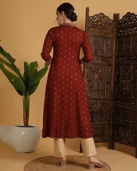 Printed Rayon Calf-Length V-Neck Semi-Flared Kurta