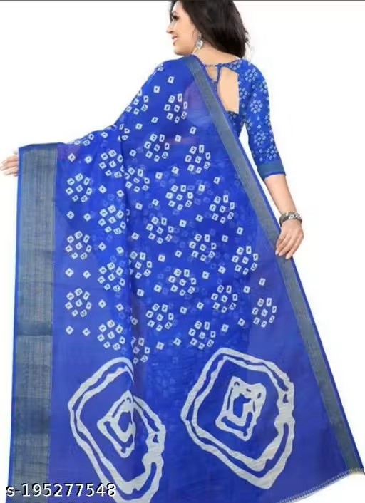 Name : Elegant Blue Bandhani Cotton Linen Saree with Zari Border & Blouse | Lightweight Daily Wear Saree for Women