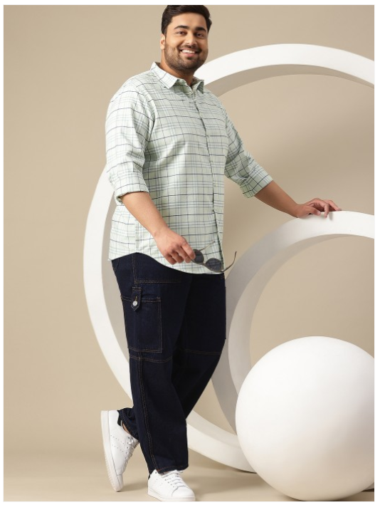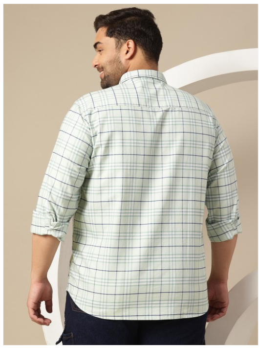 Green and White checked shirt, has a spread collar, long sleeves, button closure, curved hem