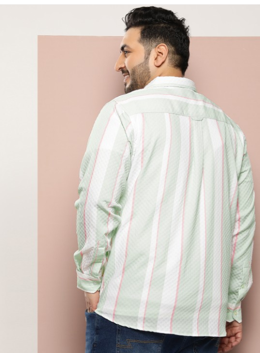 Green vertical striped opaque Casual shirt ,has a cutaway collar, button placket, 1 patch pocket, long regular sleeves, curved hem