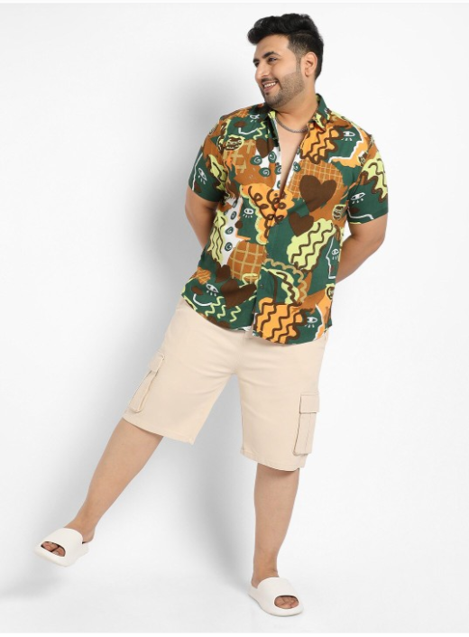 Mustard, green & white conversational printed opaque casual shirt ,has a spread collar, button placket, short regular sleeves, curved hem