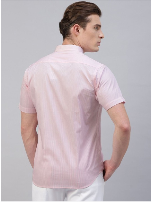 Pink Pinstripes opaque Casual shirt ,has a Band Collar, button placket, 1 pocket, short regular sleeves, curved hem