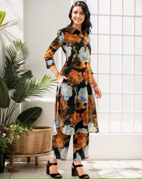 • The kurta has a collared neck, 3/4 roll-cuffed sleeves, a curved hemline, and a comfy calf length. Paired with slip-on printed palazzos, this set is all about easygoing style.