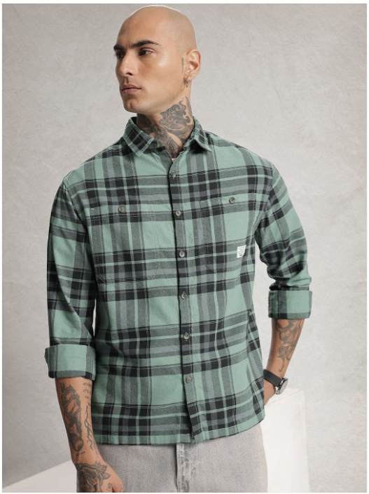 Green other checks checked opaque Casual shirt ,has a spread collar, button placket, 2 patch pocket, long drop-shoulder sleeves, curved hem