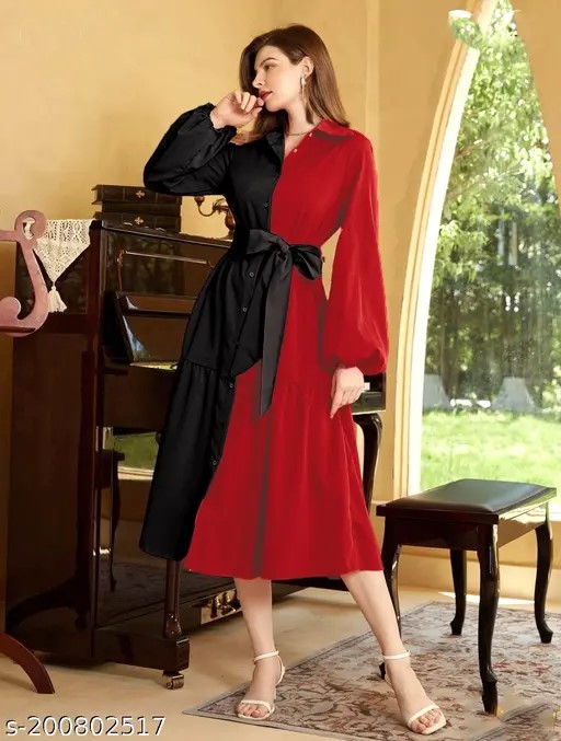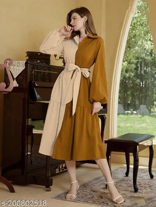 Trendy fashionable Beautiful Solid Ankle length Partywear With Long belt and beautiful long puff sleeves and Collar high quality Dresses For Womens