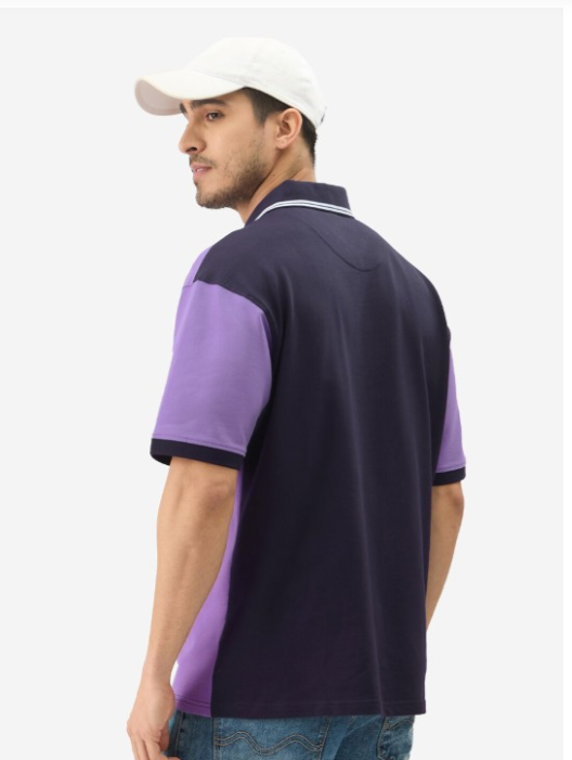 Purple Colourblocked Polo Collar Cotton Oversized T-shirt