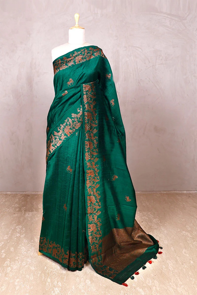 Bottle Green Raw Silk Banarasi Saree with Deer Shikargah Motifs