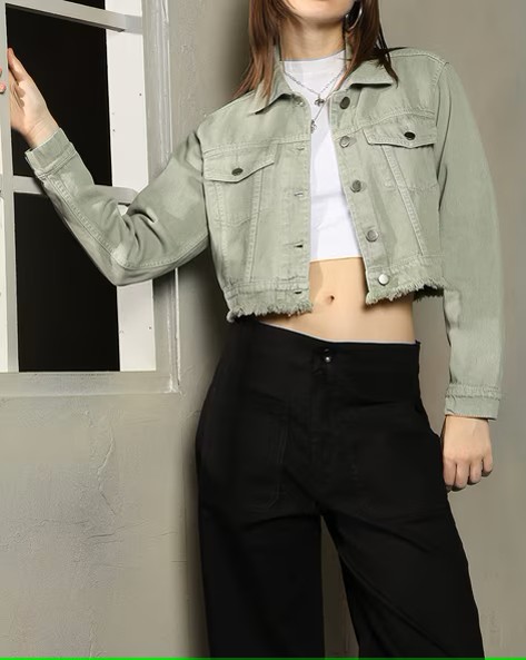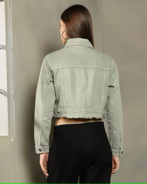 Shein Full Sleeves Frayed Hem Crop Denim Jacket