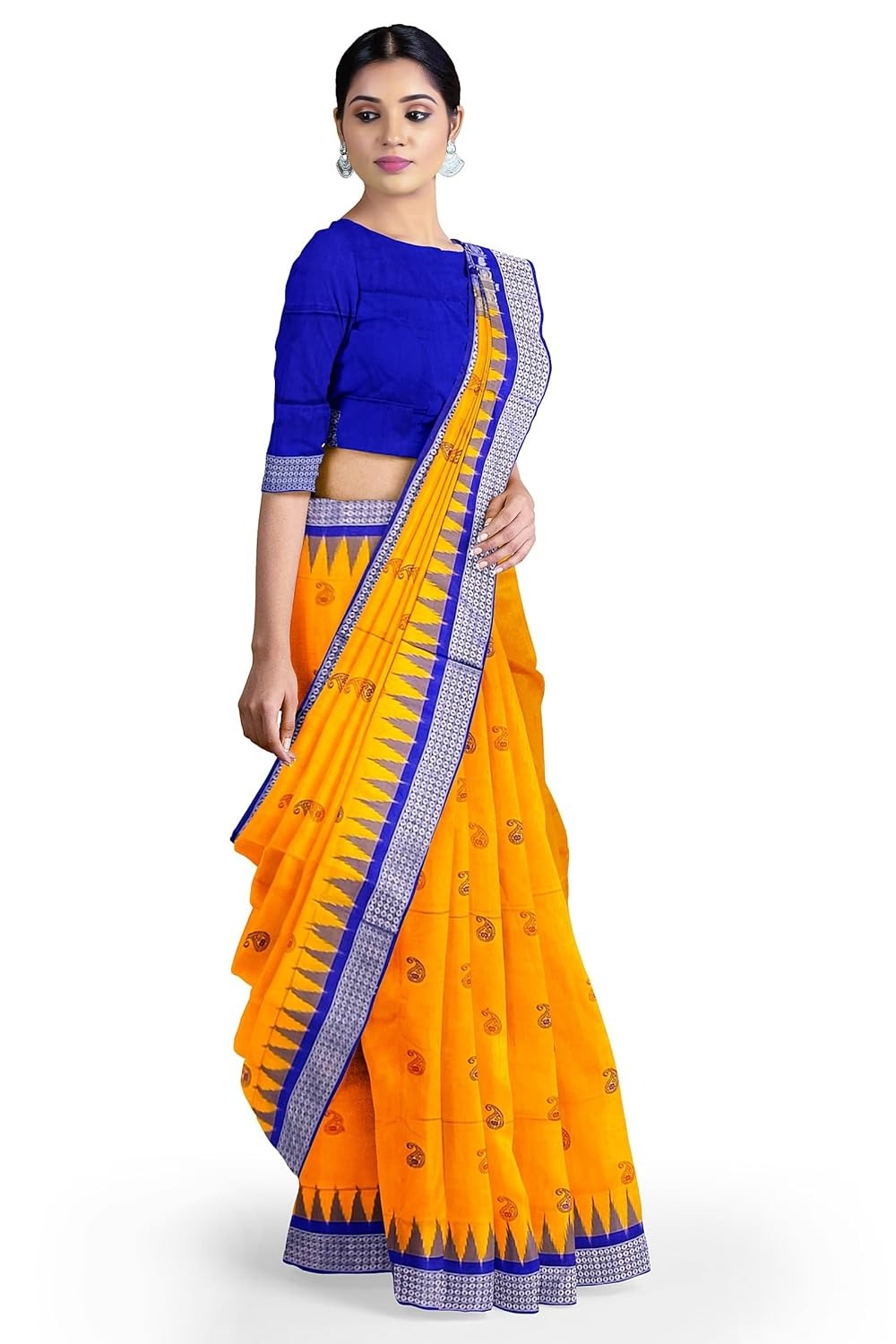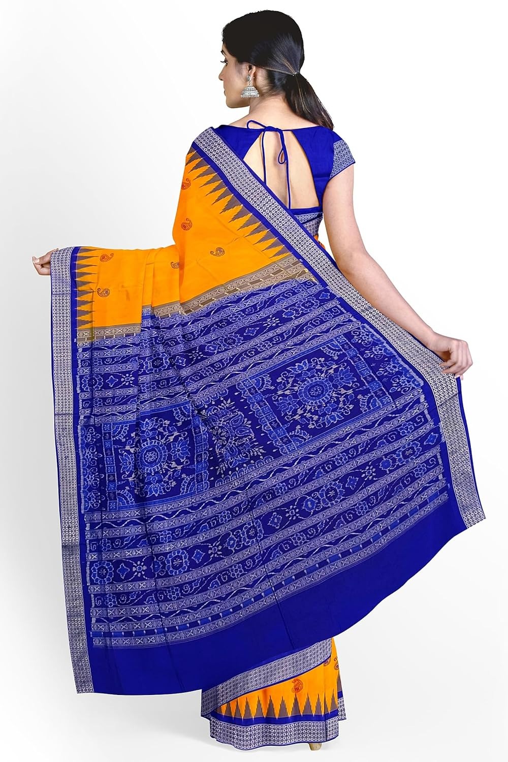 OdiKala sambalpuri bomkai silk saree with blouse piece(Sankha motifs in turmeric yellow color base with blue color pallu and boarder)
