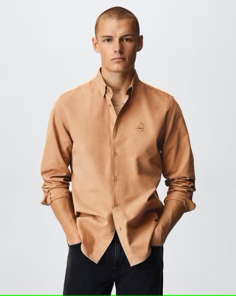 • BEIGE EMBROIDERED LOGO BUTTON-DOWN SHIRT FOR MEN.