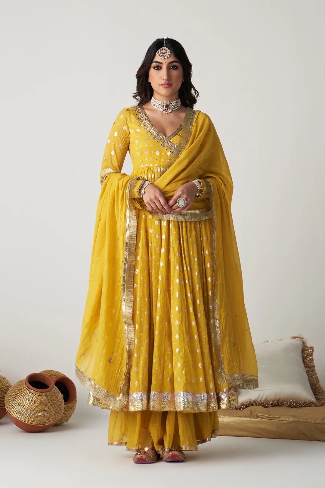 Pakeezah musturd angrakha anarkali with sharara and mukaish dupatta