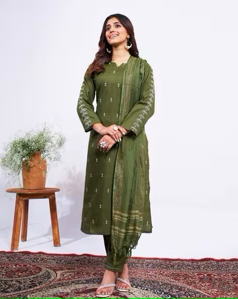 ARADHNA Women Embroidered Straight Kurta Set with Dupatta