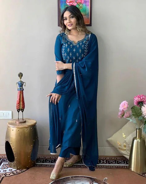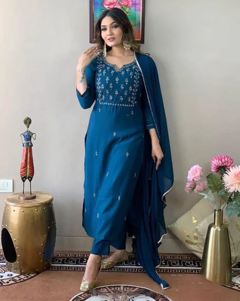 - Add charm and sophistication to your look with this beautifully embroidered kurta set. It features a notched neckline, three-fourth sleeves and a pure chinon dupatta that completes the ensemble.