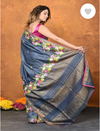 Embroidered Handloom Tussar Silk Saree (Grey)
