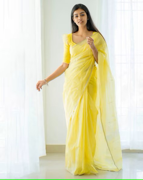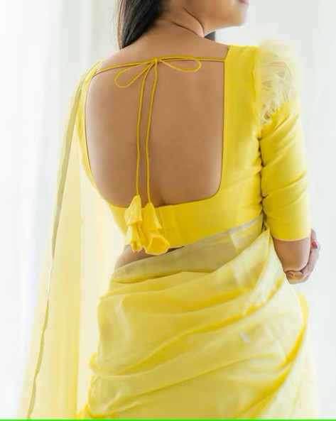 • The last image gives a detailed look of the blouse piece that comes with this saree (The model is wearing a blouse from our in-house wardrobe)