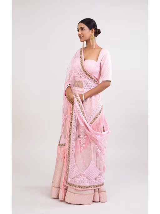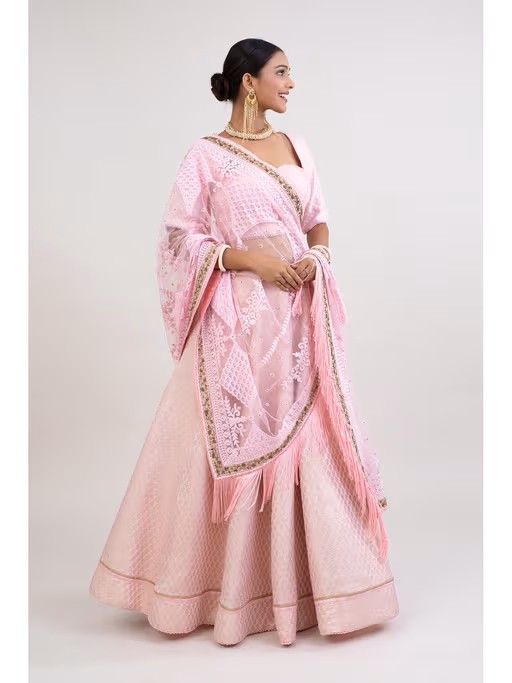 Give Yourself A Flattering Look On Special Occasions With This Monika Mathuria Datta Pink Embroidered Stitched Blouse With Lehenga And Dupatta. Tailored From High-Quality Fabric In A Comfortable Fit. It Features Embroidered Work And Has Half Sleeves, Sweetheart Style With Mid Waist Rise Style. Complete Your Look With Jewelry, Pair It Up With Heels And A Sling Bag.