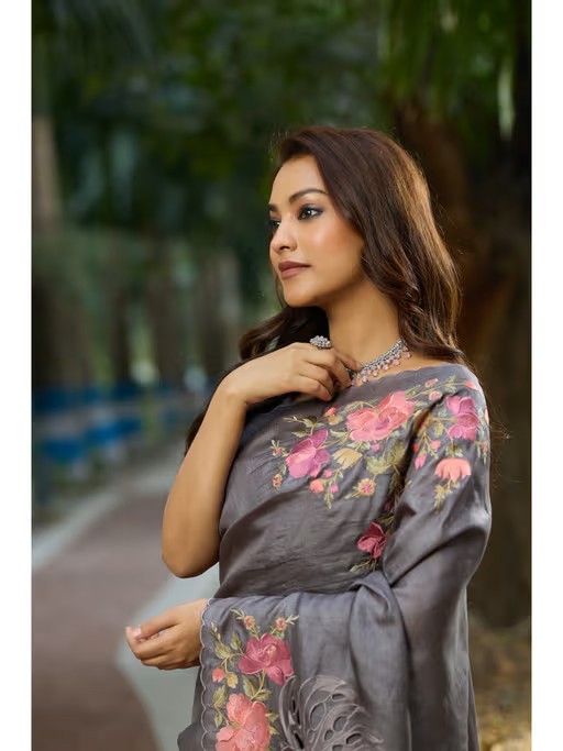Grey Tussar Cutwork and Hand Embroidery Saree with Unstitched Blouse