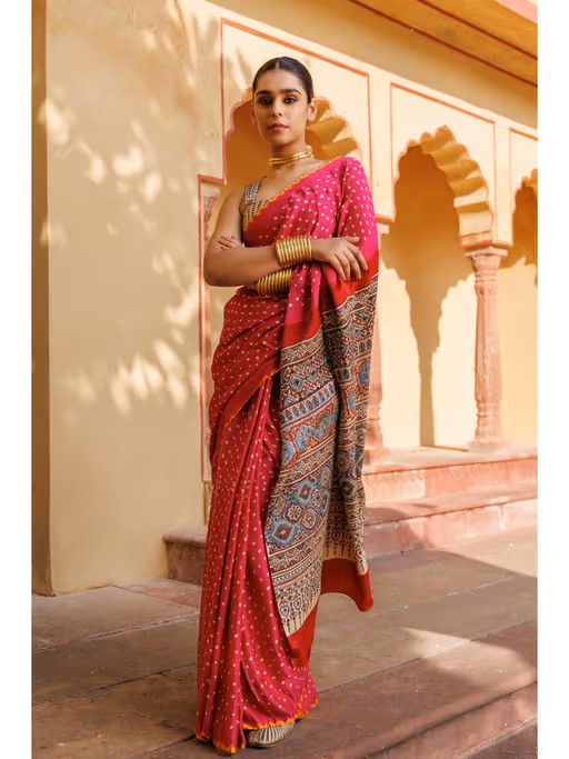 Step into grace with this Geroo Jaipur Magenta Pink Ajrakh Pure Bandhani Silk Saree with Unstitched Blouse . Geroo Jaipur ethnic sarees come with a blouse piece, which can be stitched according to your taste and preference, with this beautiful design and fabric, this saree will fetch you oodles of compliments and praise.