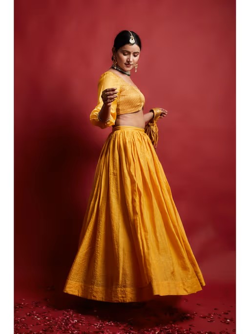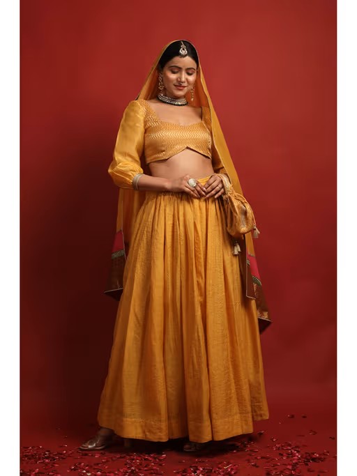 Level Up Your Look With This Yellow Lehenga Choli From Vinusto. Crafted From Chanderi, It Is Finished With Three Fourth Sleeves And A Sweetheart Neck. Complete The Look With A Pair Of Heels And Exquisite Jewellery Pieces.