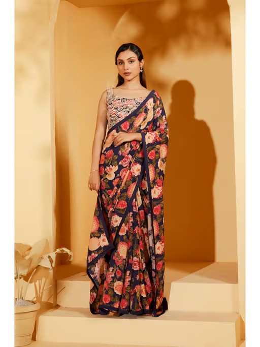 Multicolor Floral Print Saree with Petticoat and Blouse with Stitched