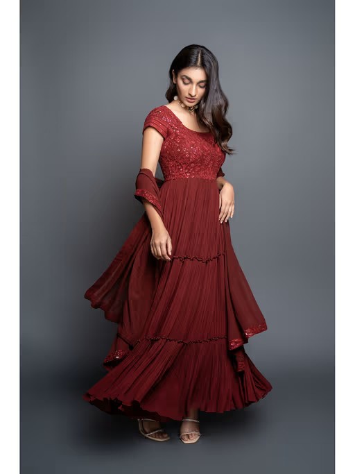 Get this trendy and stylish chikankari Indian wear from the house of Shahmeen Husain. It is crafted from high-quality georgette fabric. It features maroon embroidered dress with dupatta, it has half sleeves, round neck and slip on closure. Team it up heels and potli bag to complete your look.