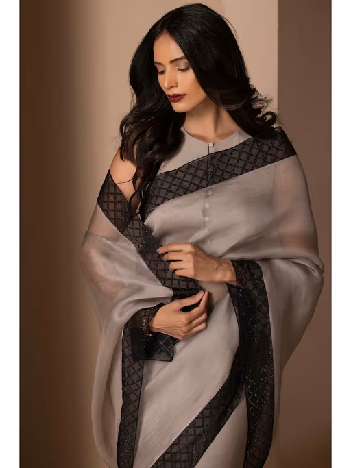 An Organza Saree Embellished with Rhinestones Detailing Along The Border and Paired with A Front Opening Blouse. Fabric : Organza (Saree and Blouse)Colour - Taupe