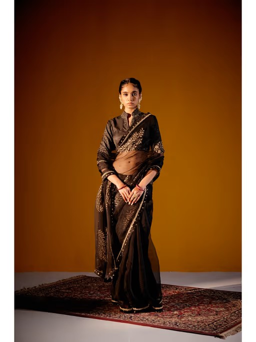 Black Organza Printed Embroidered Saree with Stitched Blouse