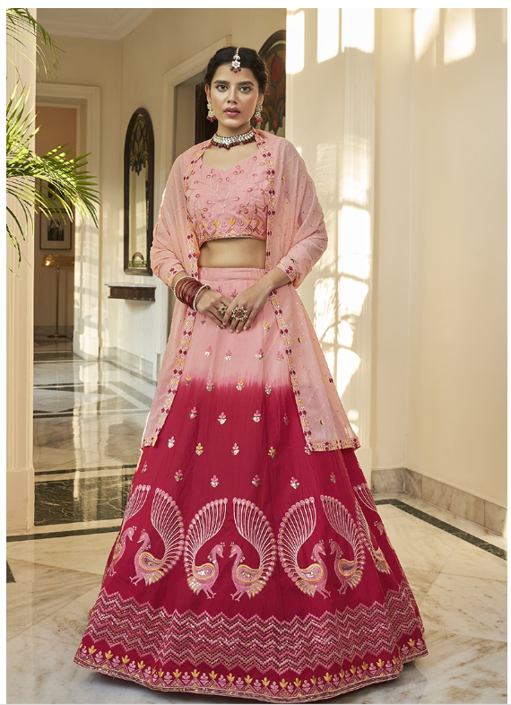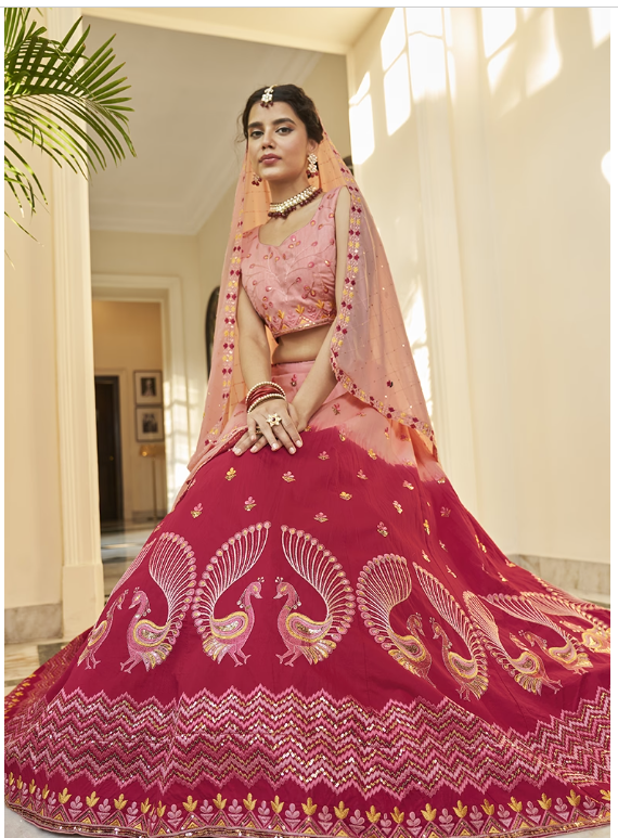 Make a graceful statement in this Peach And Rani Pink Thread Embroidered Art Silk Lehenga Set, featuring intricate embroidery on luxurious silk. Ideal for special occasions, this elegant ensemble combines timeless design with rich texture for a truly regal look.