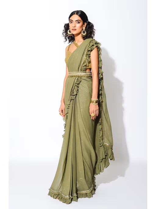 Make a style statement with this olive saree from Rishi & Vibhuti. Crafted from georgette, this exquisite saree comes with a stitched blouse and a belt. Team this saree with a pair of heels and statement jewellery.