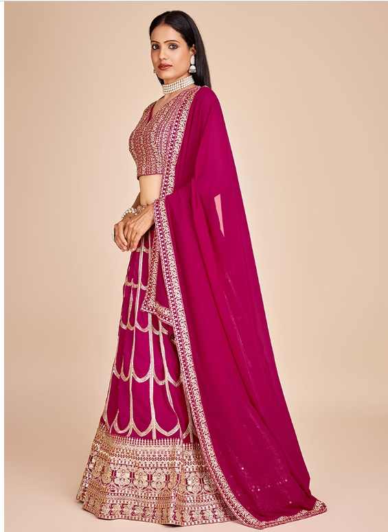 Step into elegance with this stunning Rani Pink Embroidered Georgette Lehenga Set, designed to turn heads at every celebration. A beautiful blend of tradition and trend, it's your perfect pick for any grand event.