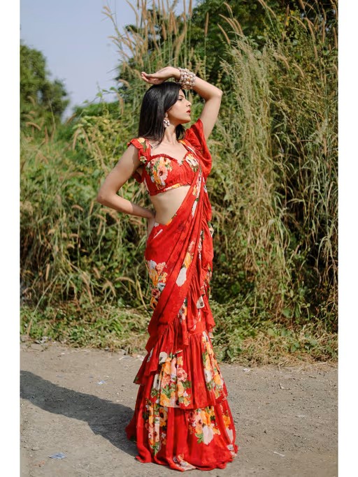 The Red Floral Printed Ruffle Saree Feature Beautiful Georgette Ruffled Layers Of The Saree Which Adds Volume and Movement. The Saree Is Paired with A Matching Floral Print Blouse with Cowrie Tassel On Shoulder Strap and On Back .