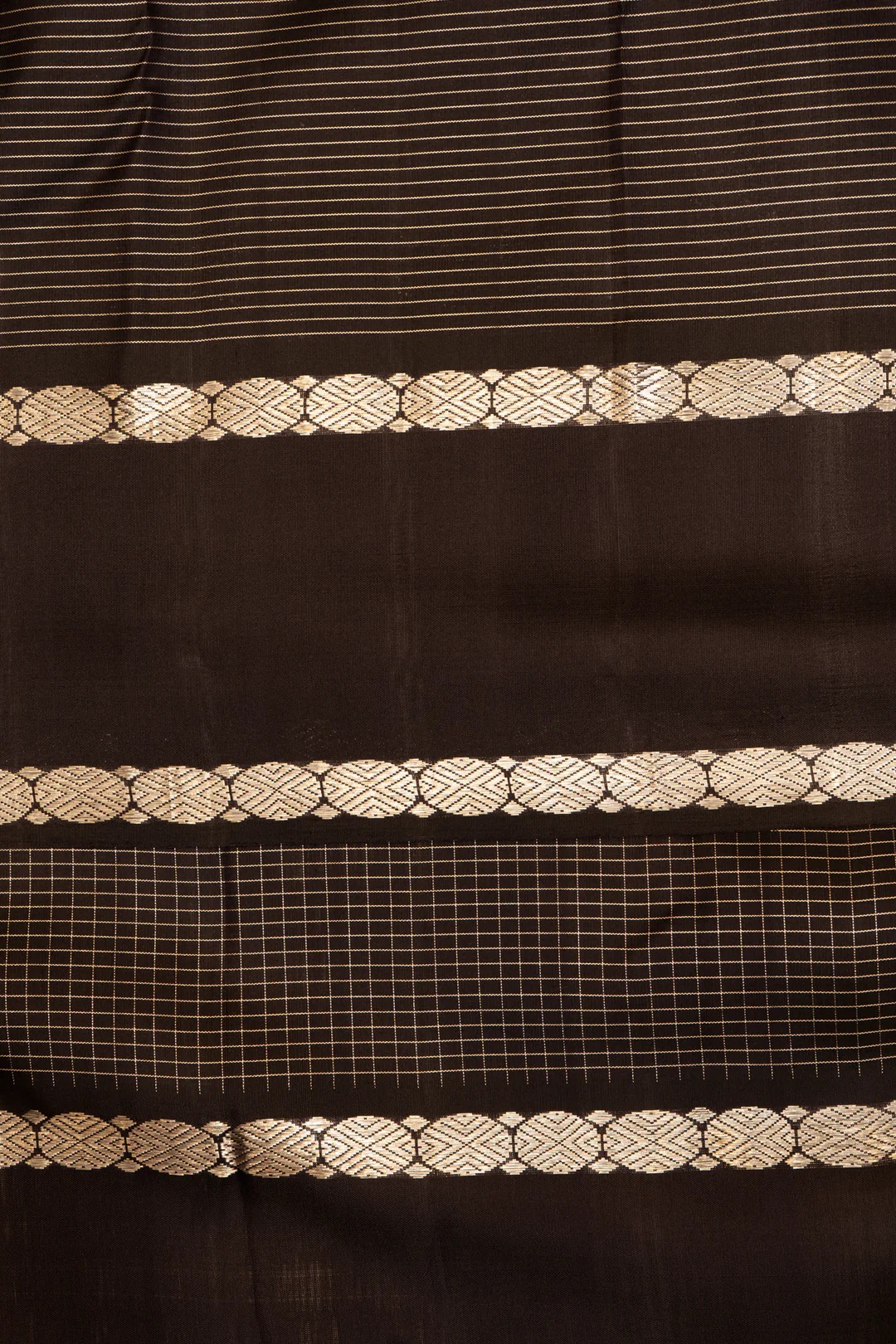 This Black Silver Zari Checks Pure Kanchipuram Silk Saree presents a timeless, minimalist design. The eye-catching handloom saree boasts silver zari checks for a subtle, fashionable touch. Appropriate for elegant events, this saree will ensure a lasting impression.