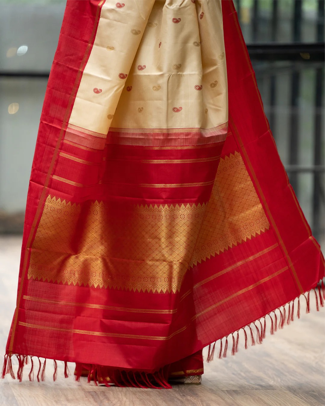 Featuring the timeless Kanchipuram in cosmic latte cream is a beautiful amalgamation of contemporary and traditional craftsmanship. Expertly hand-woven, the body is adorned with stunning paisley motifs in zari and thread and framed with a red pattu korvai border and diamond pallu.