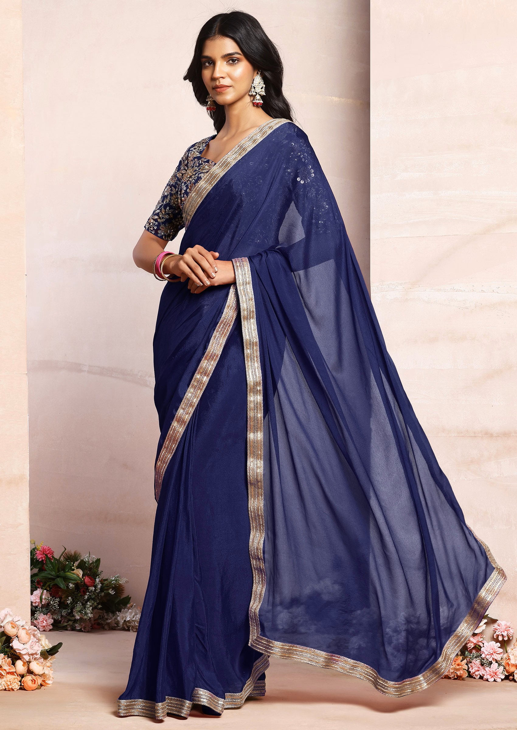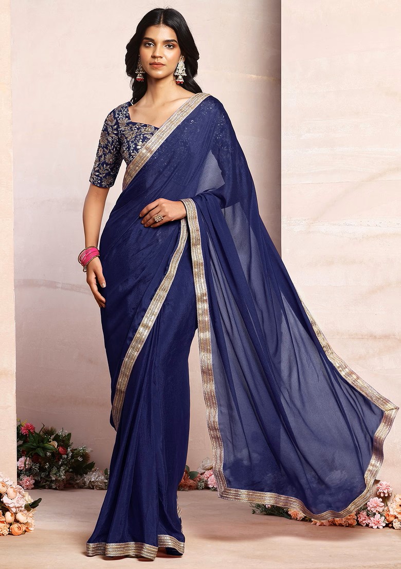 Navy Blue Pre-Stitched Saree Set With Sequin Zari Hand Embroidered Blouse
