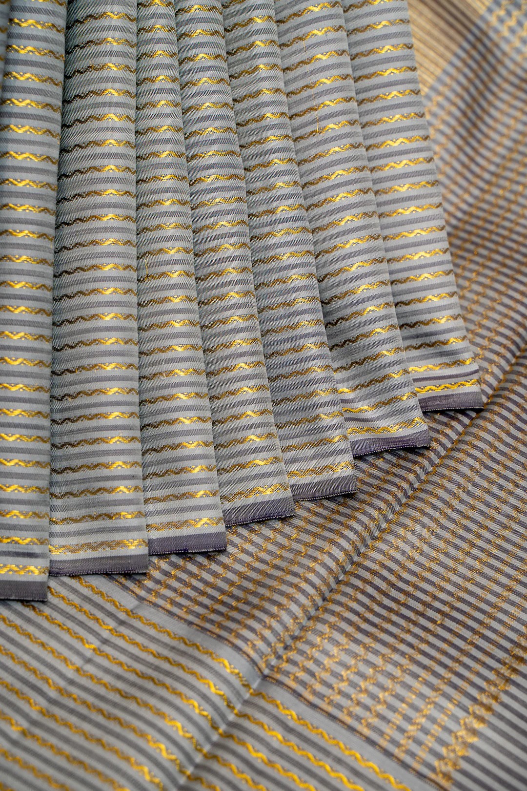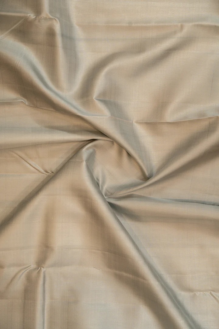 The body features an opulent bluish-grey pure kanjivaram plain silk sari with neli zari stripes border featuring on both sides with grey neli pallu.