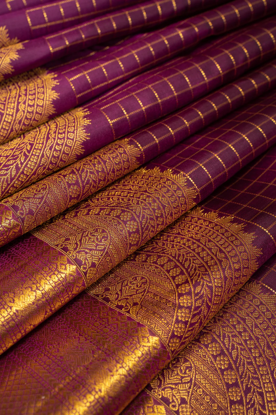 Mulberry Purple Pure Kanchipuram Silk Saree features stylish zari checks and a turning border, making it a timelessly elegant addition to any wardrobe. The traditional silk material ensures durability and long-lasting quality. Elevate your look by pairing this saree with traditional jewellery.