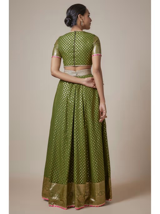Breeze In And Out Of Festive Gatherings In Our Microfoil Print Lehenga Sets That Are Sure To Become Your New Favourite This Season. Crafted In 100% Recycled Polyester, This Ensemble Is Destined To Become Your Go-To Festive Staple, Allowing You To Effortlessly Pair It With Your Most Comfortable Footwear And Accessorize With Stunning Gold Accents. Like All Of Our Pieces, This Piece Is Made In India And Checked By Hand To Ensure High Quality. Styled With A High Neck Elbow Sleeve Printed Blouse In A 100% Recycled Polyester Base With Gota Edge Lace Details And Back Metal Zipper. Styled With Our Chiffon Dupatta With Lace Detailing.