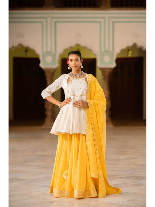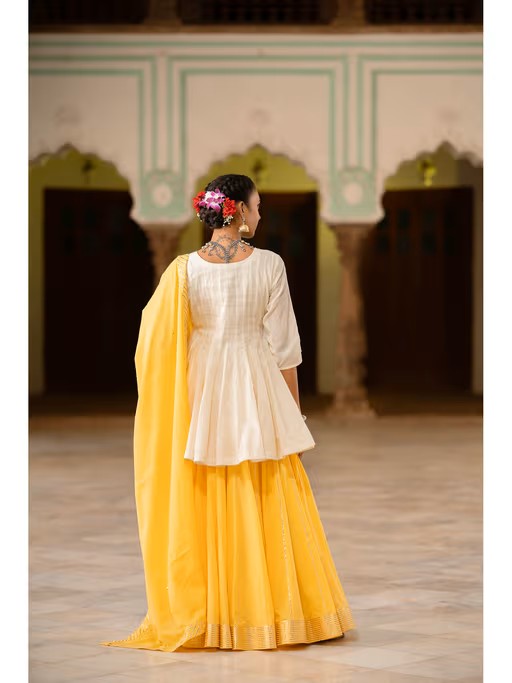 Flaunt your grace with this yellow ghaghra set from Taraasi. Made from high-quality mul, the kurti features three-fourth sleeves, a round neck and a sequined pattern. It is paired with a mid-waisted ghaghra and a chic dupatta. Style it with minimal jewellery and heels to complete the ensemble.