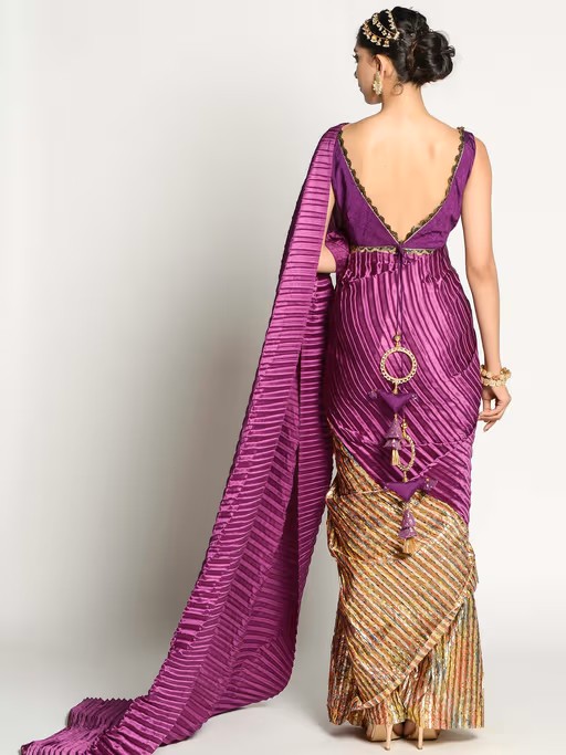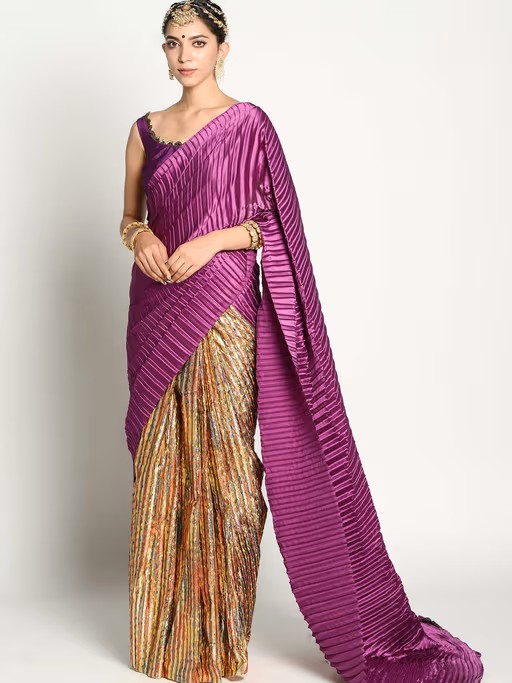The multicolored chanderi half and half saree played with heat set pleated fabric